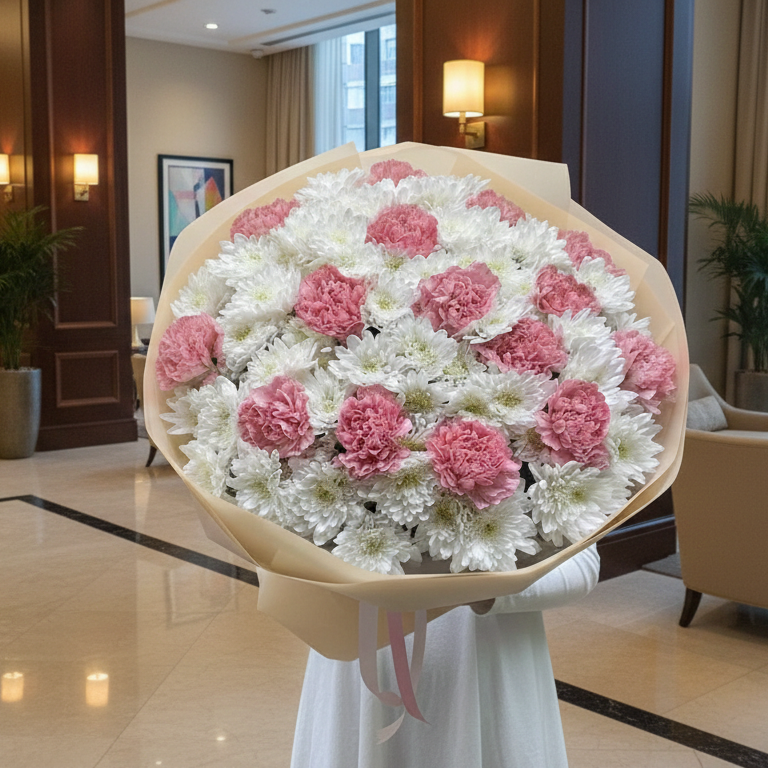 A stunning arrangement of crisp white chrysanthemums interspersed with blush pink carnations, creating a soft and elegant contrast. Hand-tied in minimalist kraft paper, this voluminous bouquet offers a timeless aesthetic. Perfectly suited for birthdays, anniversaries, or "just because" moments, it’s a sophisticated expression of grace and charm