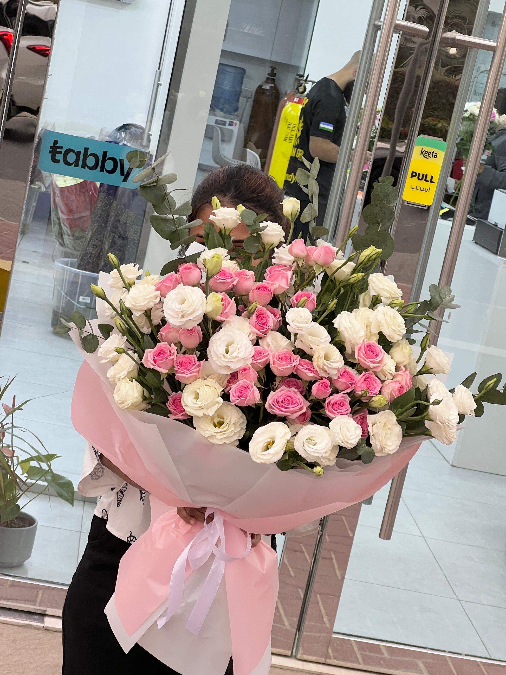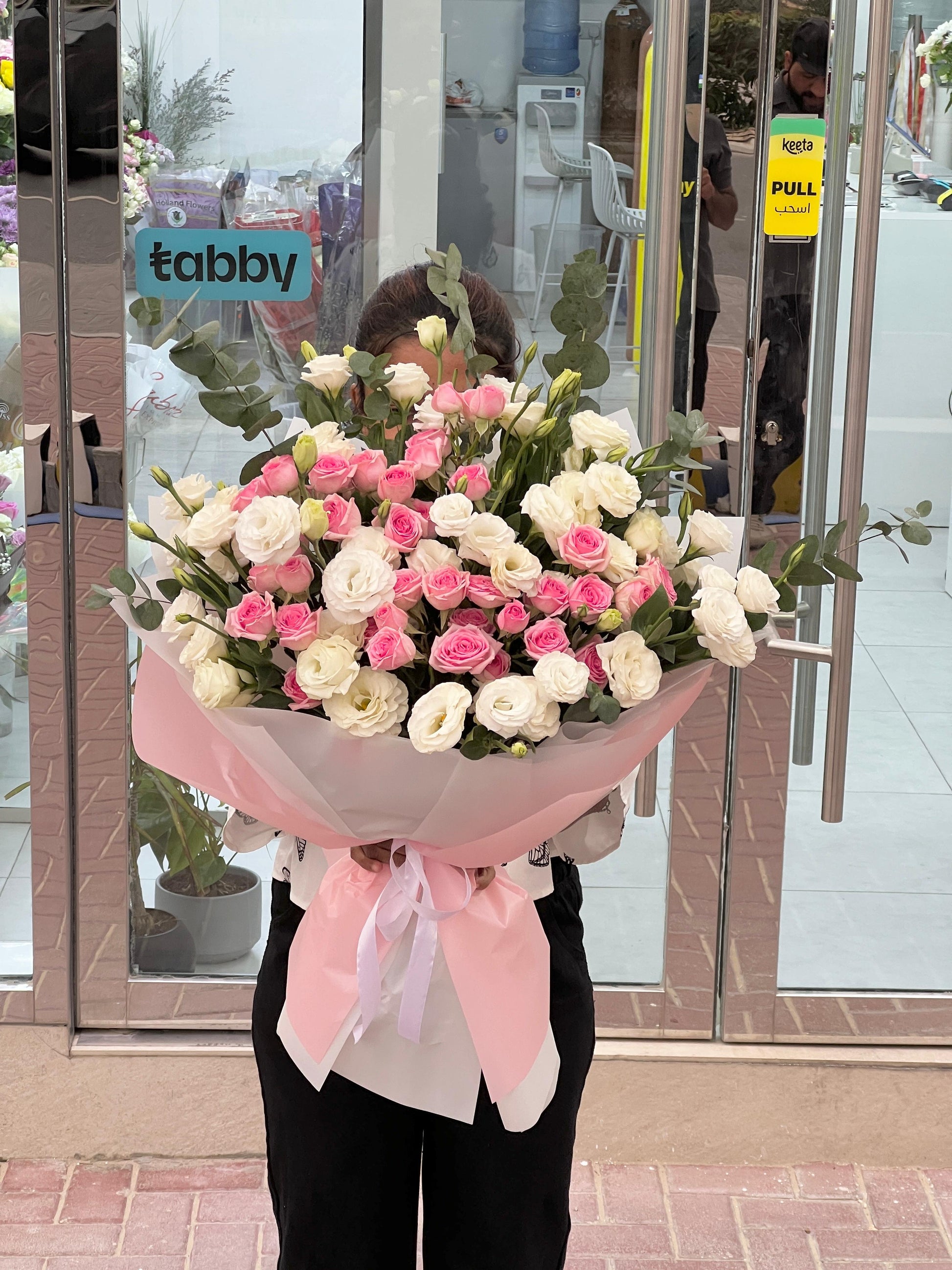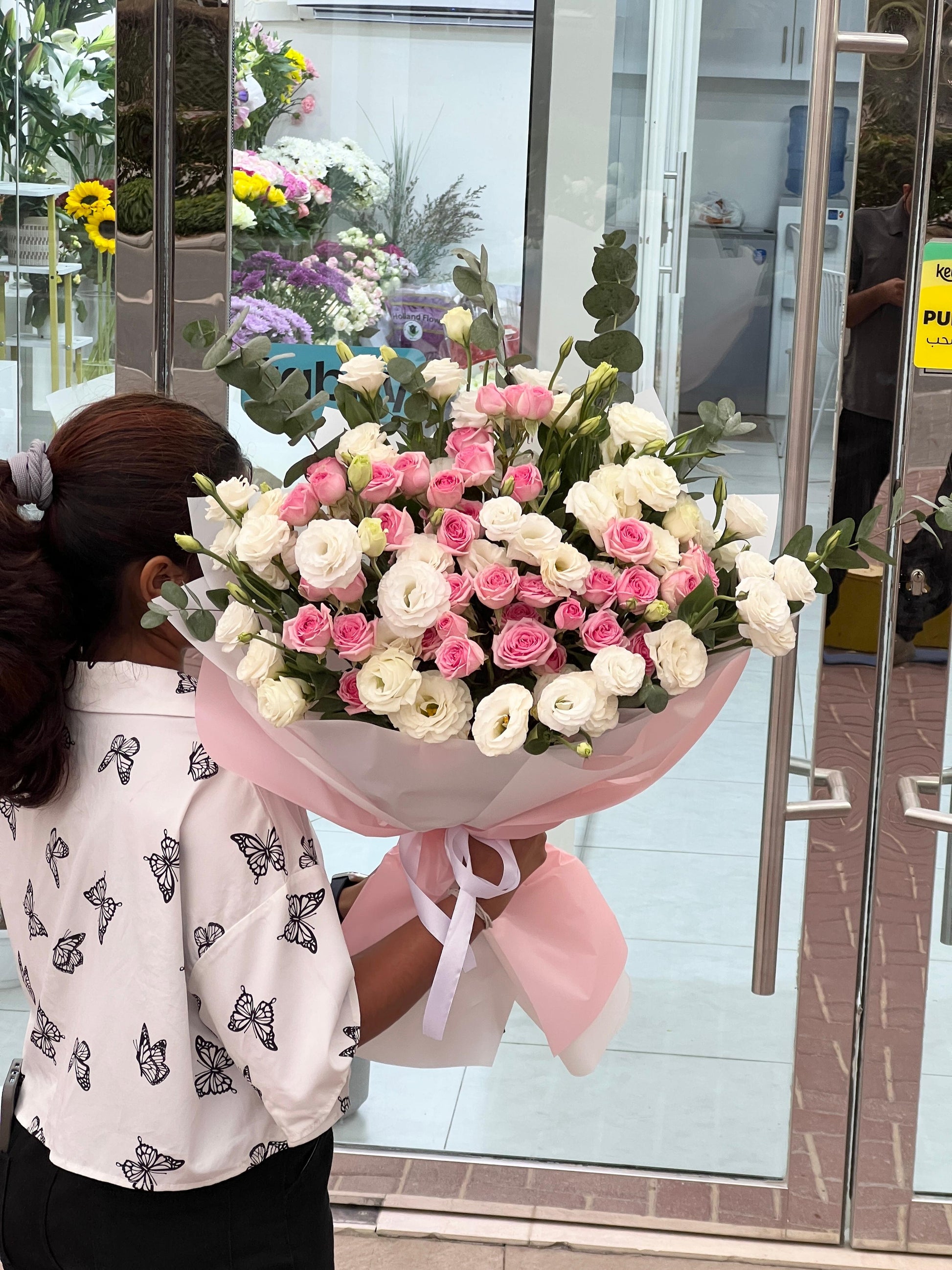 The Pure Elegance bouquet showcases 6 delicate pink spray roses and 7 graceful white lisianthus, beautifully accented with fresh eucalyptus and wrapped in classic white. The soft pink and white palette, paired with lush greenery, creates a timeless and refined arrangement that radiates beauty, purity, and grace. Perfect for romantic gestures, heartfelt celebrations, or adding a touch of sophistication to any occasion.