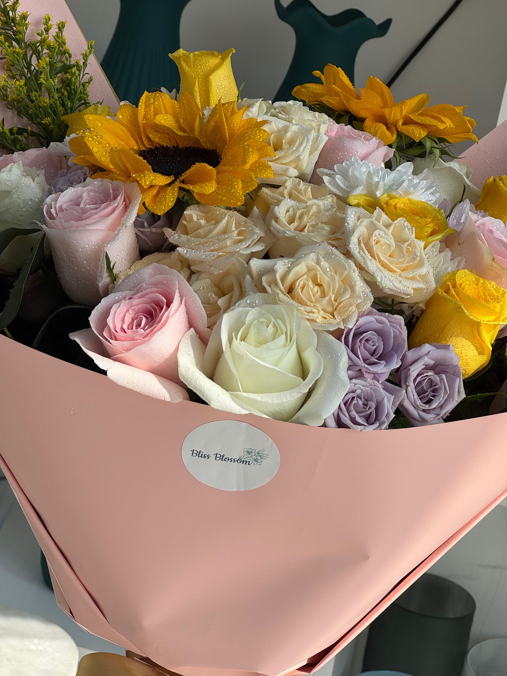 Radiate joy with this vibrant garden mix! Featuring golden Sunflowers and a premium blend of Pink, White, and Yellow Roses, this bouquet is a masterpiece of color. Accented with delicate Spray Roses, Chrysanthemums, and fragrant Eucalyptus, it’s elegantly wrapped in blush pink with a gold ribbon. Perfect for birthdays or "just because" to bring sunshine to any home.
